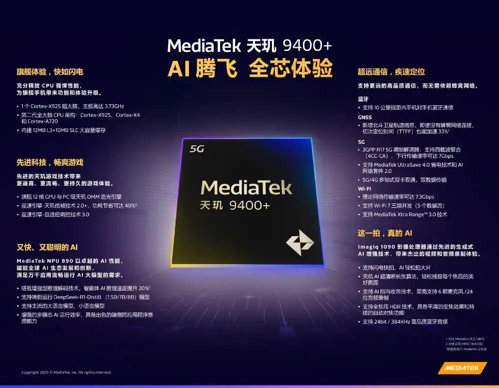 天玑 9400+ 集成 MediaTek 第八代 AI 处理器 NPU 890,端侧支持DeepSeek-R1推理模型四大关键技术,同时支持增强型推理解码技术(SpD+),智能体AI任务的推理速度可提升20%。