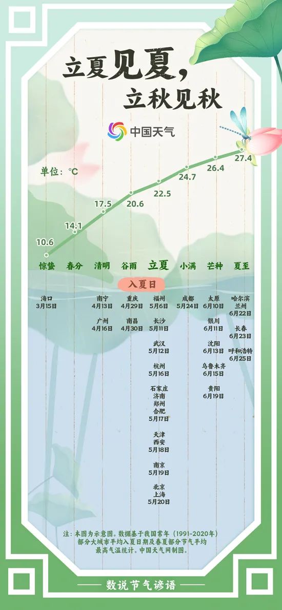 不过,立夏并不等于入夏,我国幅员辽阔,南北方入夏步伐不一。常年立夏节气期间,夏天的脚步从华南、江南中部等地一路北进,越过长江,最北能抵达华北中部地区。大城市中,长沙、武汉、南京、合肥、郑州、济南、石家庄、北京、天津等地往往在立夏时节入夏,而更北的呼和浩特、兰州、沈阳、哈尔滨等地要到6月芒种或夏至节气才陆续进入真正的夏天。