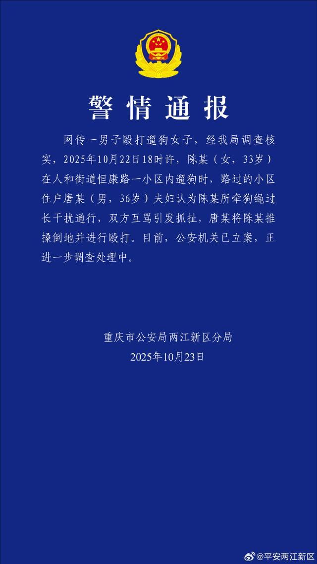10月23日,重庆市公安局两江新区分局通报,网传一男子殴打遛狗女子,经调查核实,10月22日18时许,陈某(女楠希配资,33岁)在人和街道恒康路一小区内遛狗时,路过的小区住户唐某(男,36岁)夫妇认为陈某所牵狗绳过长干扰通行,双方互骂引发抓扯,唐某将陈某推搡倒地并进行殴打。目前,公安机关已立案,正进一步调查处理中。(平安两江新区)